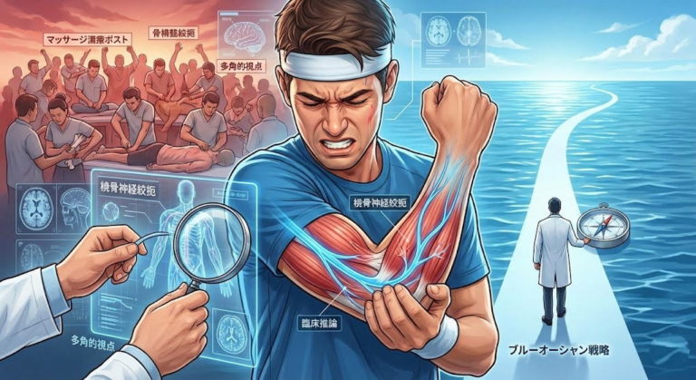 1. 一般的な治療で「治らないテニス肘」の正体 「肘の外側が痛い」。いわゆるテニス肘(外側上顆炎)は、臨床で非常によく遭遇する症状です。 教科書的な医学知識では、これは「手首を屈曲させる筋肉(尺側手根屈筋腱や円回内筋腱)の腱症」、つまり腱の変性であるとされています。 患部の周辺には組織の線維化や癒着が起きているため、一般的な徒手療法では、これらの癒着を剥がす(リリースする)アプローチを行います。 […]
